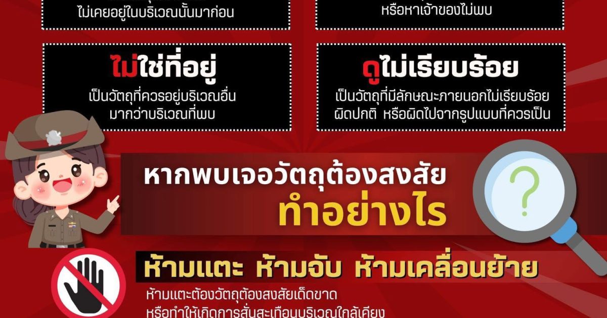อย่างไรก็ตาม หากพี่น้องประชาชนพบเห็นวัตถุต้องสงสัย ให้แจ้งให้ผู้รับผิดชอบสถานที่ดังกล่าวทราบโดยเร็ว และโทรศัพท์แจ้งเจ้าหน้าที่ตำรวจได้ที่ สายด่วน 191 ได้ตลอด 24 ชั่วโมง