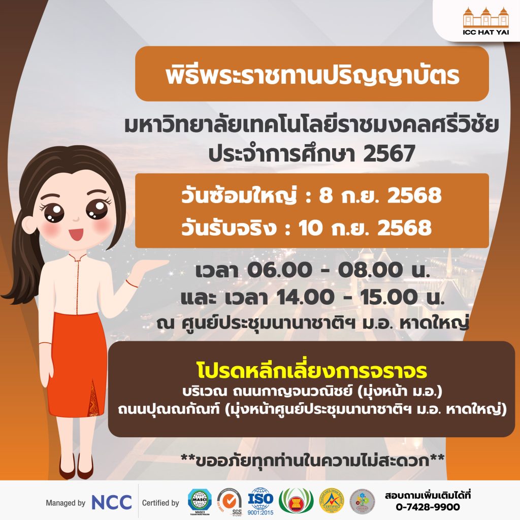 มหาวิทยาลัยเทคโนโลยีราชมงคลศรีวิชัยและศูนย์ประชุมนานาชาติฉลองสิริราชสมบัติครบ ๖๐ ปี (ICC Hat Yai) ขออภัยทุกท่านสำหรับความไม่สะดวก
