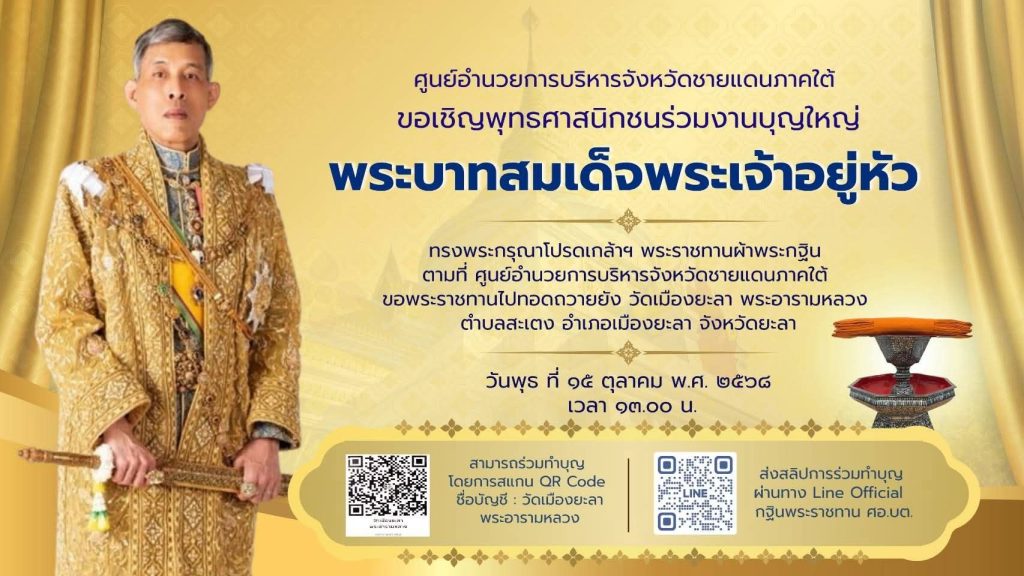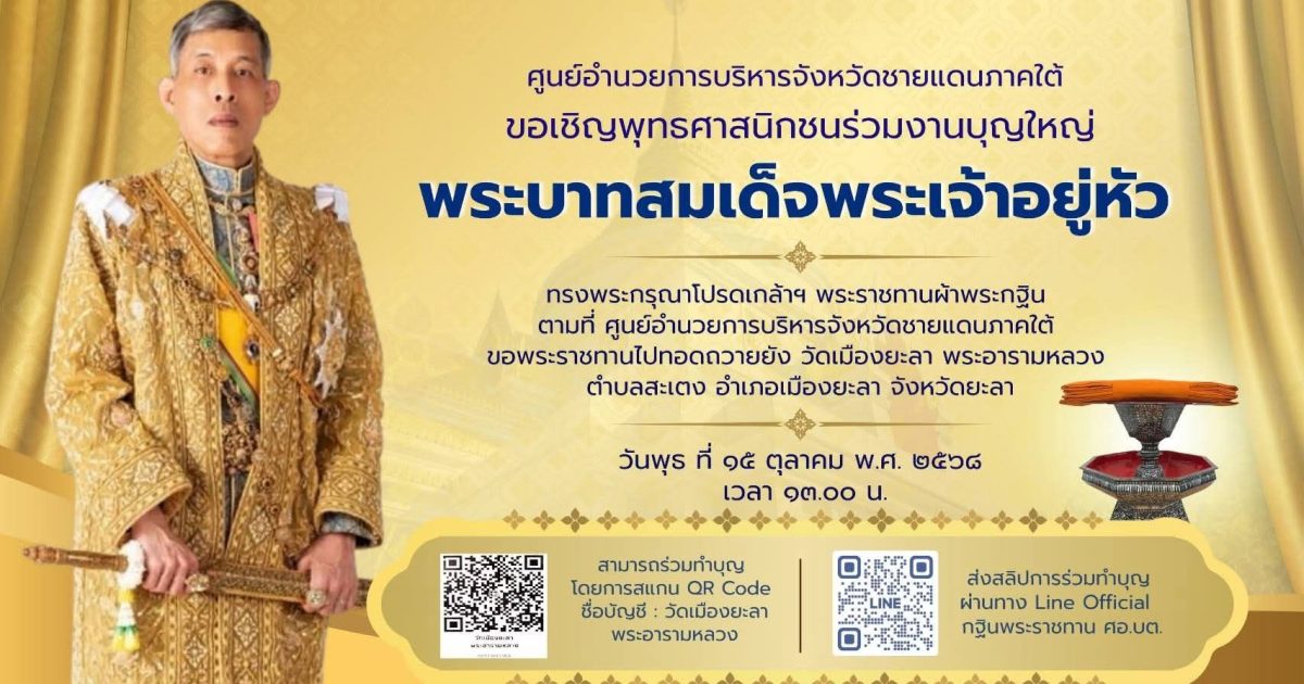 ขอเชิญพุทธศาสนิกชนร่วมงานบุญใหญ่ 4 ตุลาคม 2568 โดย admin / ข่าวประชาสัมพันธ์ ขอเชิญพุทธศาสนิกชนร่วมงานบุญใหญ่พระบาทสมเด็จพระเจ้าอยู่หัว … ทรงพระกรุณาโปรดเกล้าฯ พระราชทานผ้าพระกฐิน ตามที่ ศูนย์อำนวยการบริหารจังหวัดชายแดนภาคใต้ ขอพระราชทานไปทอดถวายยัง วัดเมืองยะลา พระอารามหลวง ตำบลสะเตง อำเภอเมืองยะลา จังหวัดยะลาวันพุธ ที่ 15 ตุลาคม พ.ศ. 2568 เวลา 13.00 น.