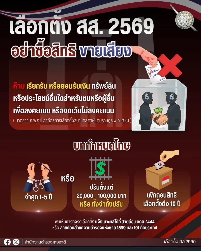 ขายเสียง ขายเสียง ผิดกฎหมาย 20 มกราคม 2569 โดย admin / ข่าวประชาสัมพันธ์ ขายเสียง ขายเสียง ผิดกฎหมาย เลือกตั้ง สส. 8 กุมภาพันธ์ นี้ไปใช้สิทธิตามระบอบประชาธิปไตย#เลือกตั้ง2569 #สํานักงานตํารวจแห่งชาติ#Royalthaipolice