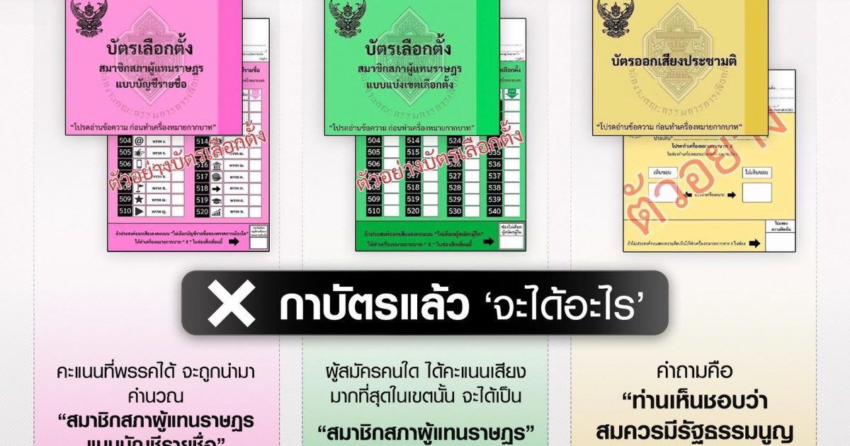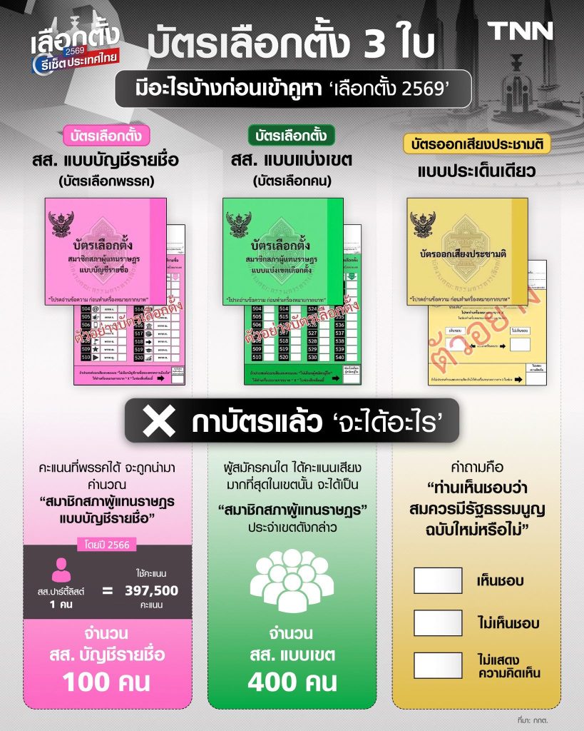 ประชาชนที่ไปใช้สิทธิในวันที่ 8 ก.พ. โดยไม่ได้เลือกตั้งล่วงหน้า ที่หน่วยเลือกตั้งตามทะเบียนบ้าน จะได้รับบัตรลงคะแนนครบทั้งหมด 3 ใบ ได้แก่