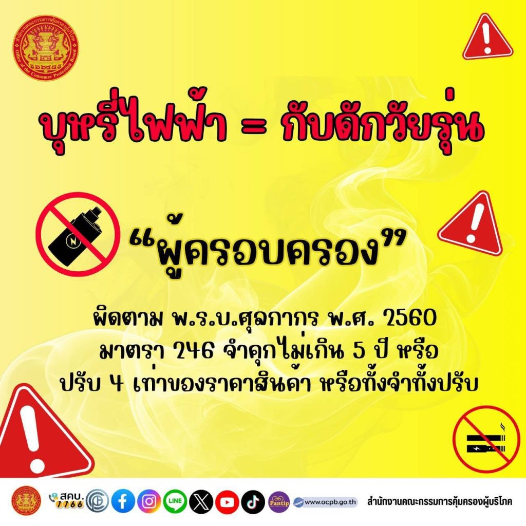 บุหรี่ไฟฟ้า = กับดักวัยรุ่น 15 ตุลาคม 2568 โดย admin / ข่าวประชาสัมพันธ์ บุหรี่ไฟฟ้า = กับดักวัยรุ่น Website : www.ocpb.go.th Facebook : สำนักงานคณะกรรมการคุ้มครองผู้บริโภค Instagram : ocpbofficial X : @ocpb_official YouTube : OCPB Official TikTok : ocpbofficial Web App : https://ocpbconnect.ocpb.go.th