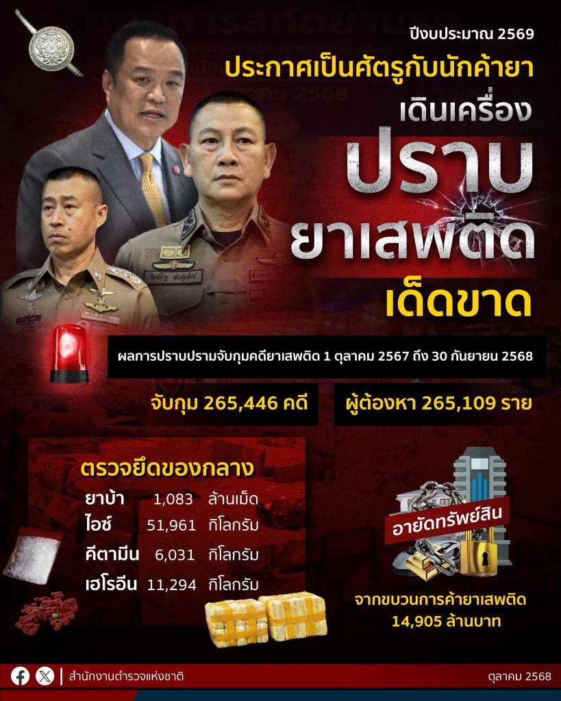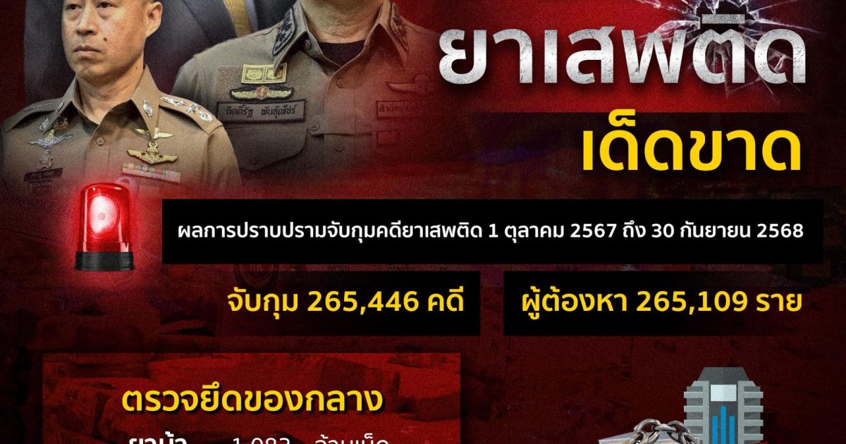 สำนักงานตำรวจแห่งชาติ เปิดเผยผลการปราบปรามจับกุมคดียาเสพติด ตั้งแต่ 1 ตุลาคม 2567 ถึง 30 กันยายน 2568