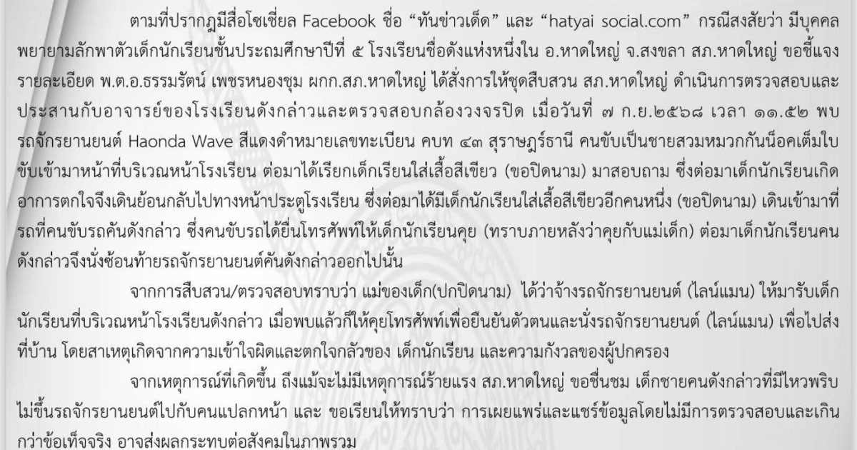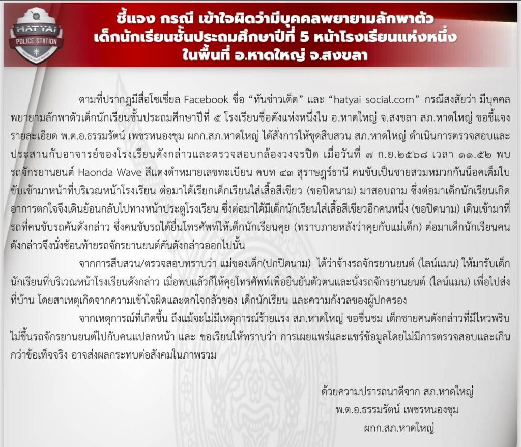 ผกก.สภ.หาดใหญ่ ชี้แจง กรณี เข้าใจผิดว่ามีบุคคลพยายามลักพาตัวเด็ก