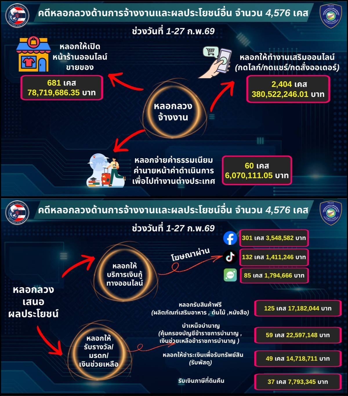– หลอกให้ทำงานเสริมออนไลน์ (กดไลก์/กดแชร์/กดสั่งออเดอร์) มีจำนวน 2,404 เคส มูลค่าเสียหายกว่า 380 ล้านบาท