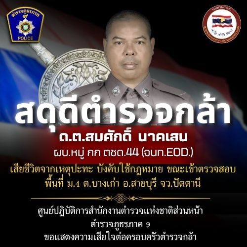 สดุดีตำรวจกล้า 15 ตุลาคม 2568 โดย admin / ข่าวประชาสัมพันธ์ สดุดีตำรวจกล้าด.ต.สมศักดิ์ นาคเสน ผบ.หมู่ กก.ตชด.44 (จนท. EOD.)เสียชีวิตจากเหตุปะทะ ขณะเข้าบังคับใช้กฎหมาย ตรวจสอบพื้นที่ ม.4 ต.บางเก่า อ.สายบุรี จว.ปัตตานี เมื่อวันที่ 15 ตุลาคม 2568#ตำรวจภูธรภาค9 ขอแสดงความเสียใจอย่างสุดซึ้งต่อครอบครัวตำรวจกล้า#สดุดีตำรวจกล้า #ขอแสดงความเสียใจ