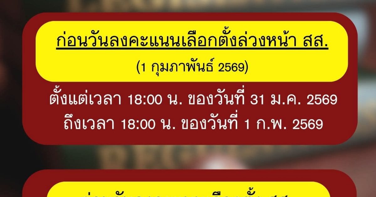 สำนักคณะกรรมการการเลือกตั้ง 30 มกราคม 2569 โดย admin / ข่าวประชาสัมพันธ์ สำนักคณะกรรมการการเลือกตั้ง เตือนห้าม ขาย จำหน่าย จ่ายแจก จัดเลี้ยง สุราทุกชนิด