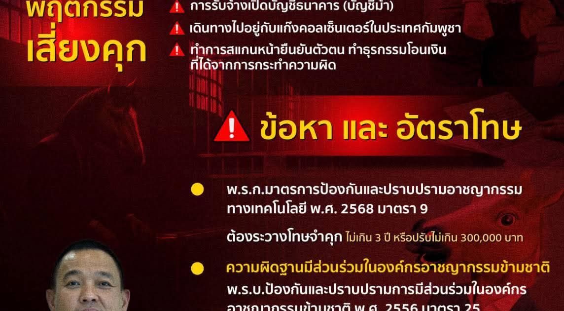วันนี้ (19 ตุลาคม 2568) พล.ต.ต.ศิริวัฒน์ ดีพอ รองโฆษกสำนักงานตำรวจแห่งชาติ กล่าวว่า พล.ต.อ.กิตติ์รัฐ พันธุ์เพ็ชร์ ผู้บัญชาการตำรวจแห่งชาติ มีความห่วงใยพี่น้องประชาชน จากอาชญากรรมทางไซเบอร์ที่สร้างความเสียหายให้กับพี่น้องประชาชนเป็นจำนวนมาก โดยเฉพาะอย่างยิ่งความเสียหายจากการหลอกลวงของแก๊งคอลเซ็นเตอร์ ที่มีคนไทยบางส่วนไปมีส่วนร่วมในการหลอกลวงพี่น้องประชาชน คนไทยด้วยกัน โดยการรับจ้างเปิดบัญชีม้า และข้ามแดนไปอยู่ที่ประเทศเพื่อนบ้าน เพื่อสแกนหน้าในการทำธุรกรรมโอนเงินให้กับแก๊งคอลเซ็นเตอร์