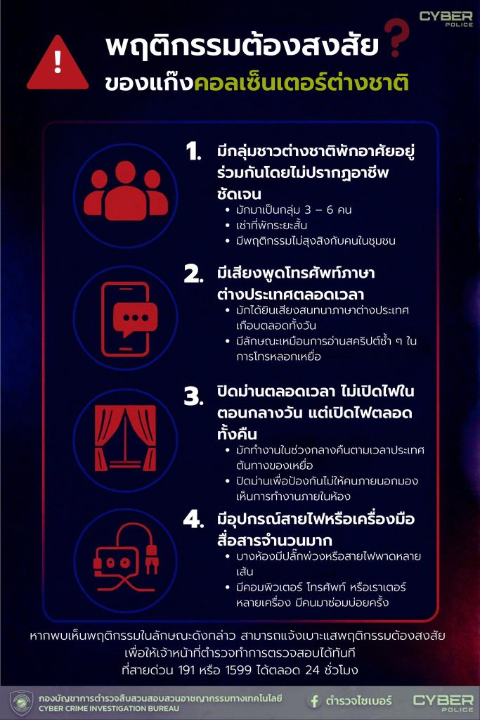 ตำรวจไซเบอร์ขอความร่วมมือประชาชน หากพบพฤติกรรมต้องสงสัยในลักษณะดังกล่าว อย่านิ่งเฉย! สามารถแจ้งเบาะแสทันทีได้ที่ สายด่วน 191 หรือ 1599 ได้ตลอด 24 ชั่วโมง
