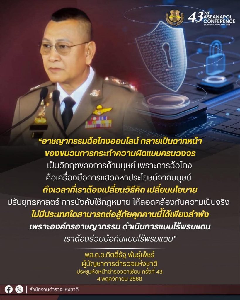 พล.ต.อ.กิตติ์รัฐ พันธุ์เพ็ชร์ ผู้บัญชาการตำรวจแห่งชาติ กล่าวในการเปิดงานประชุมหัวหน้าตำรวจอาเซียน ครั้งที่ 43 ( 4 พฤศจิกายน 2568 )