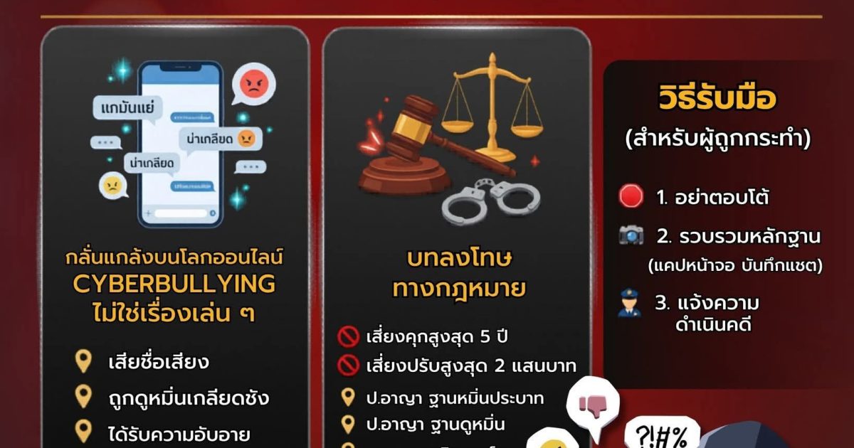 โพสต์ด่าทอ เหยียด ประจาน 3 เมษายน 2569 โดย admin / ข่าวเตือนภัย cyber โพสต์ด่าทอ เหยียด ประจานมีความผิดตามกฎหมาย อาจต้องรับโทษติดคุก-ปรับ หรือทั้งจำทั้งปรับการกลั่นแกล้งบนโลกออนไลน์ ไม่ใช่เรื่องเล่น ๆหากถูกกระทำ อย่าตอบโต้ เก็บหลักฐาน แจ้งความดำเนินคดีด้วยความปรารถนาดีจากสำนักงานตำรวจแห่งชาติ#หยุดบูลลี่#สำนักงานตำรวจแห่งชาติ#RoyalThaiPolice