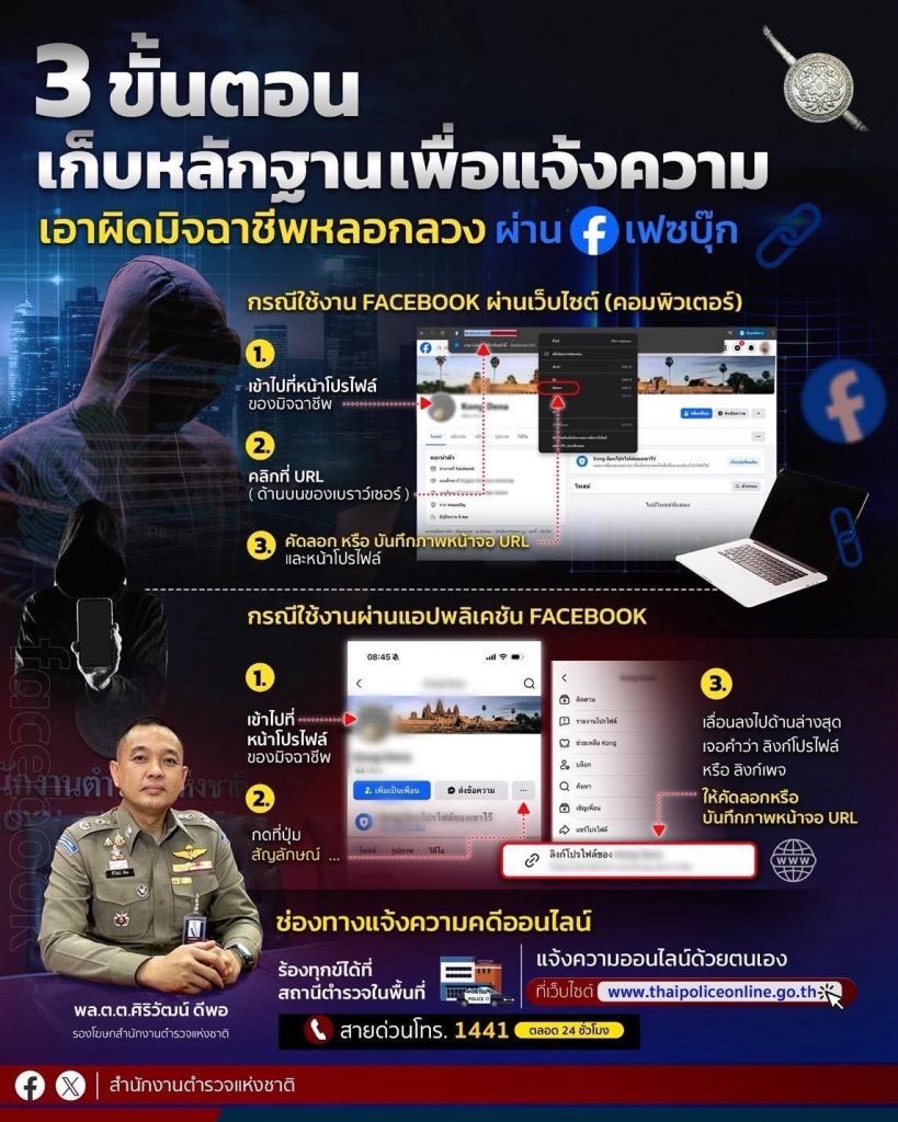 สำนักงานตำรวจแห่งชาติ แนะนำวิธีเก็บ URL เฟซบุ๊กมิจฉาชีพ ให้สามารถใช้เป็นหลักฐานในการดำเนินคดี