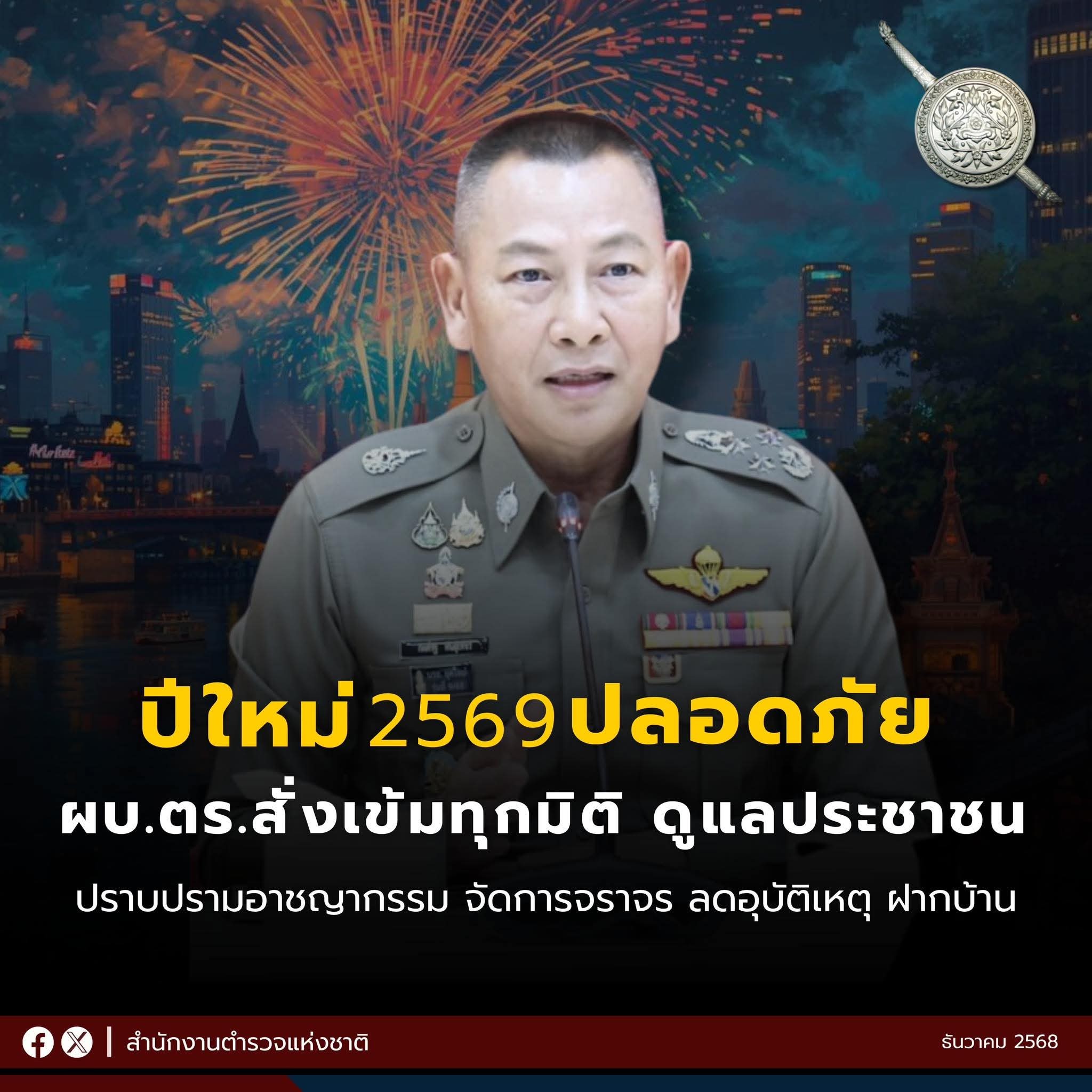 ผบ.ตร. สั่งเข้ม “ปีใหม่ 2569” ปลอดภัยทุกมิติ ปราบอาชญากรรม ดูแลการจราจร คุมเข้มจุดเสี่ยง ป้องกันเหตุ