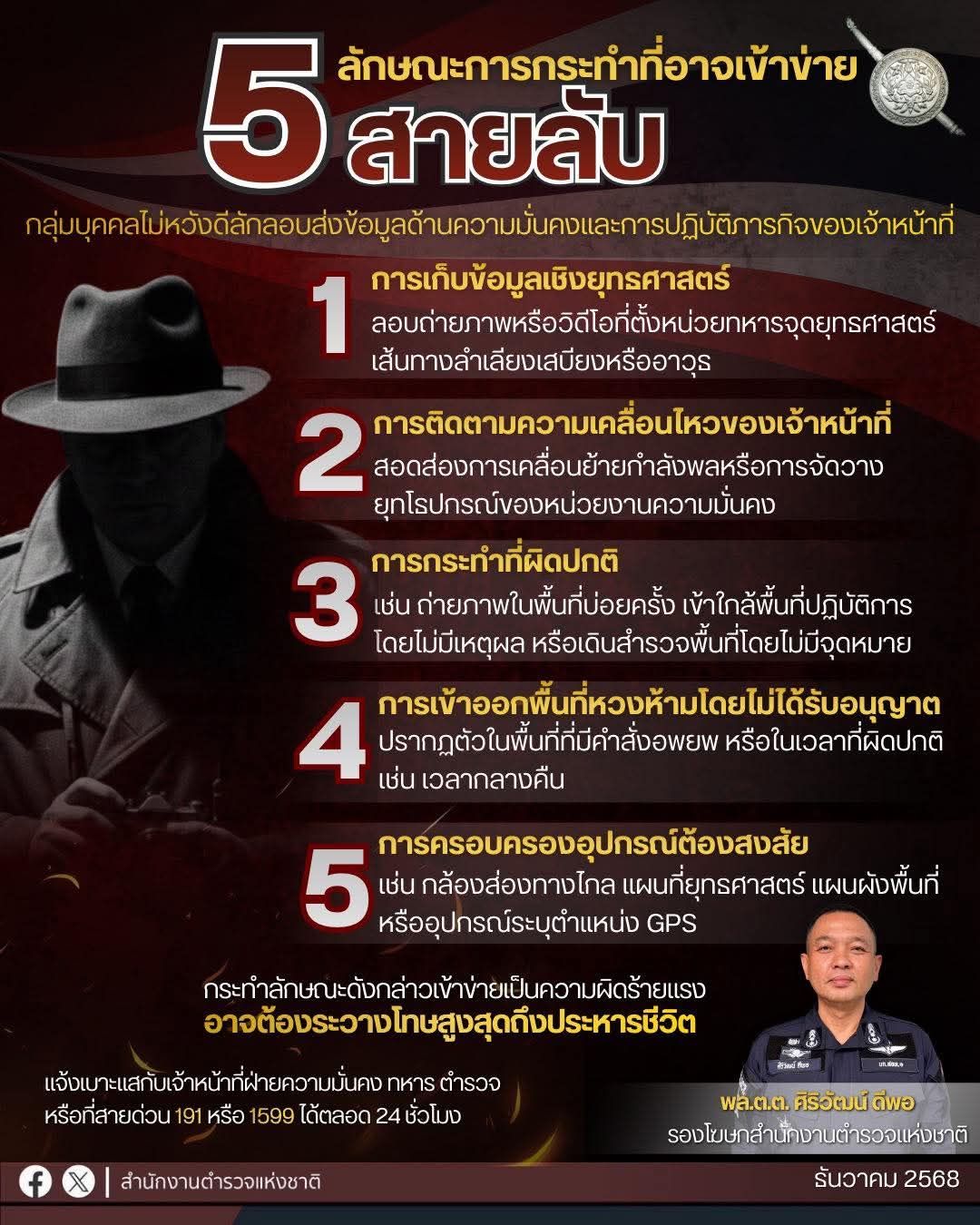 5 พฤติกรรม “สายลับ“ ลักษณะการกระทำของ “บุคคล หรือ กลุ่มบุคคล” ผู้ไม่หวังดีลอบส่งข้อมูล ด้านความมั่นค