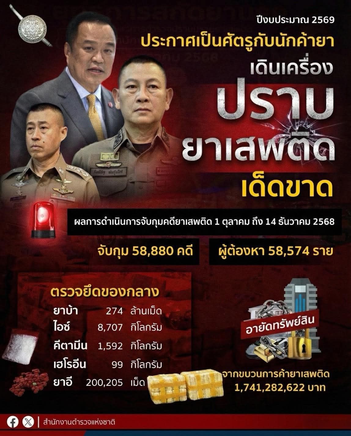 สำนักงานตำรวจแห่งชาติประกาศศัตรูกับขบวนการค้ายาเสพติด 2 เดือนครึ่ง รุกจับแก๊งยานรกเฉียด 6 หมื่นคน ยึ