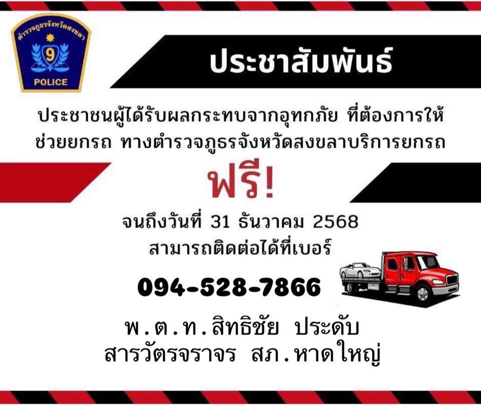 ยกรถฟรี !! ประชาชนผู้ได้รับผลกระทบจากอุทกภัย ที่ต้องการให้ช่วยยกรถ ตำรวจภูธรจังหวัดสงขลา บริการยกรถ