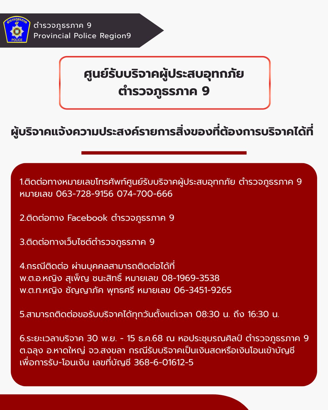 ตำรวจภูธรภาค9 เปิดศูนย์รับบริจาคผู้ประสบภัยตำรวจภูธรภาค9ณ หอประชุมรณศิลป์ ตำรวจภูธรภาค9 ต.ฉลุง อ.หาด