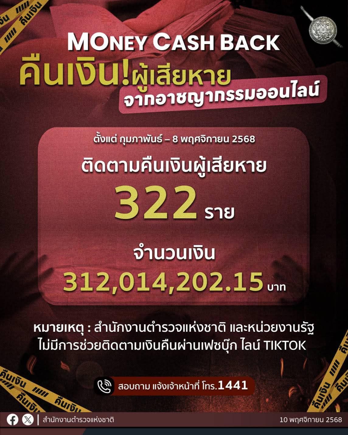 Money Cash Backคืนเงินผู้เสียหายจากอาชญากรรมออนไลน์ตั้งแต่ กุมภาพันธ์ – 8 พฤศจิกายน 2568ติดตามคืนเงิ