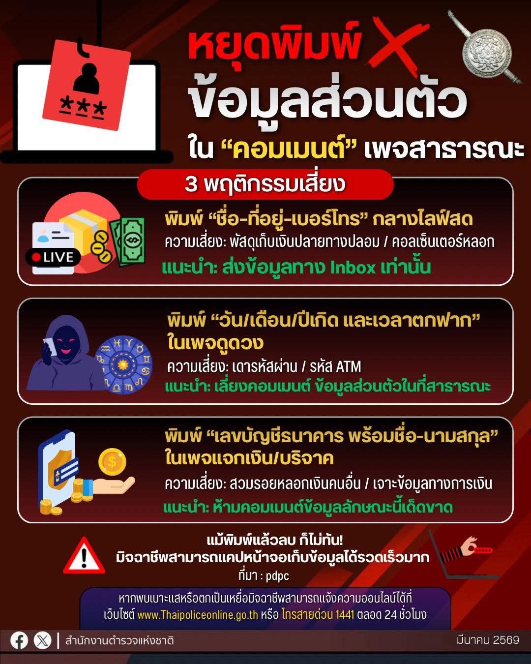 หยุดทำ 3 พฤติกรรมเสี่ยง เป็นเหยื่อมิจฉาชีพหยุดพิมพ์ข้อมูลส่วนตัว ในคอมเมนต์เพจสาธารณะ พิมพ์ชื่อ-ที่อ