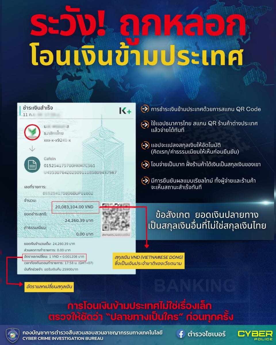 กลลวงมิจฉาชีพรูปแบบใหม่!“สแกนจ่ายต่างประเทศ แต่ปลายทางคือมิจฉาชีพ”.ปัจจุบันพบกลโกงรูปแบบใหม่ที่มีควา