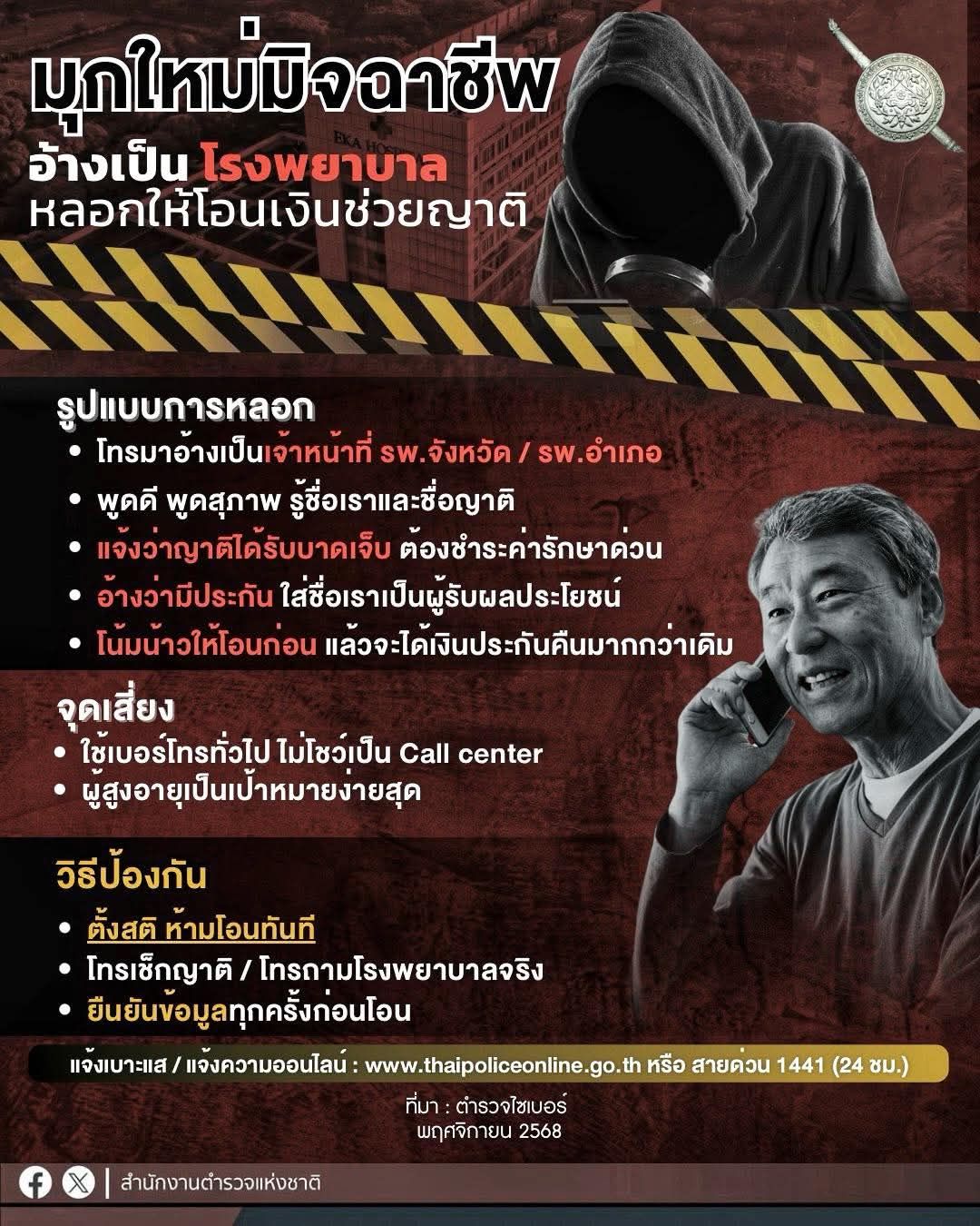 มุกใหม่มิจฉาชีพ! อ้างเป็นโรงพยาบาลหลอกว่าญาติป่วย ก่อนเร่งให้โอนเงิน.การหลอกลวงของแก๊งมิจฉาชีพในปัจจ