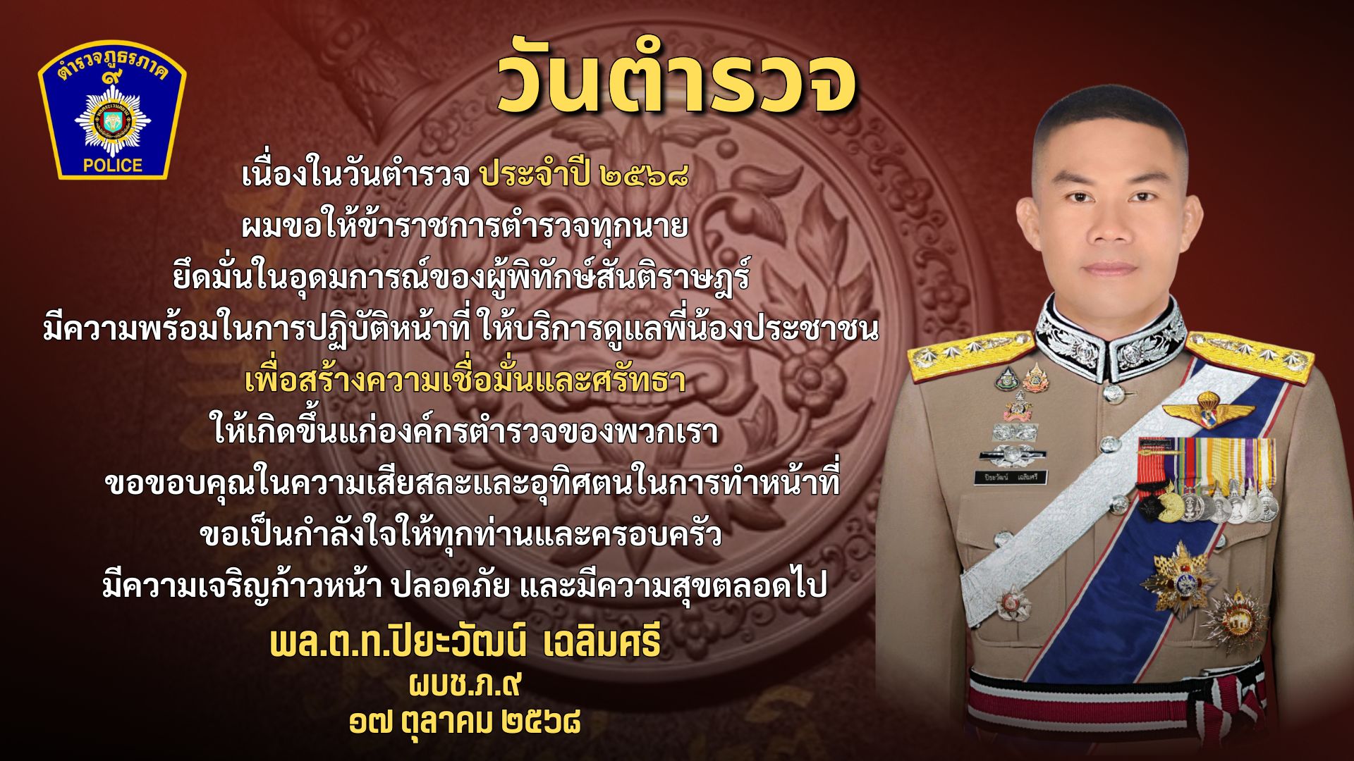 สารของ พล.ต.อ.กิตติ์รัฐ พันธุ์เพ็ชร์ ผู้บัญชาการตำรวจแห่งชาติ เนื่องใน “วันตำรวจ”17 ตุลาคม 2568“พี่น